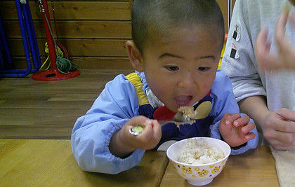 園の給食で出している金芽米を土鍋で炊き、味噌をつけていただきました!!